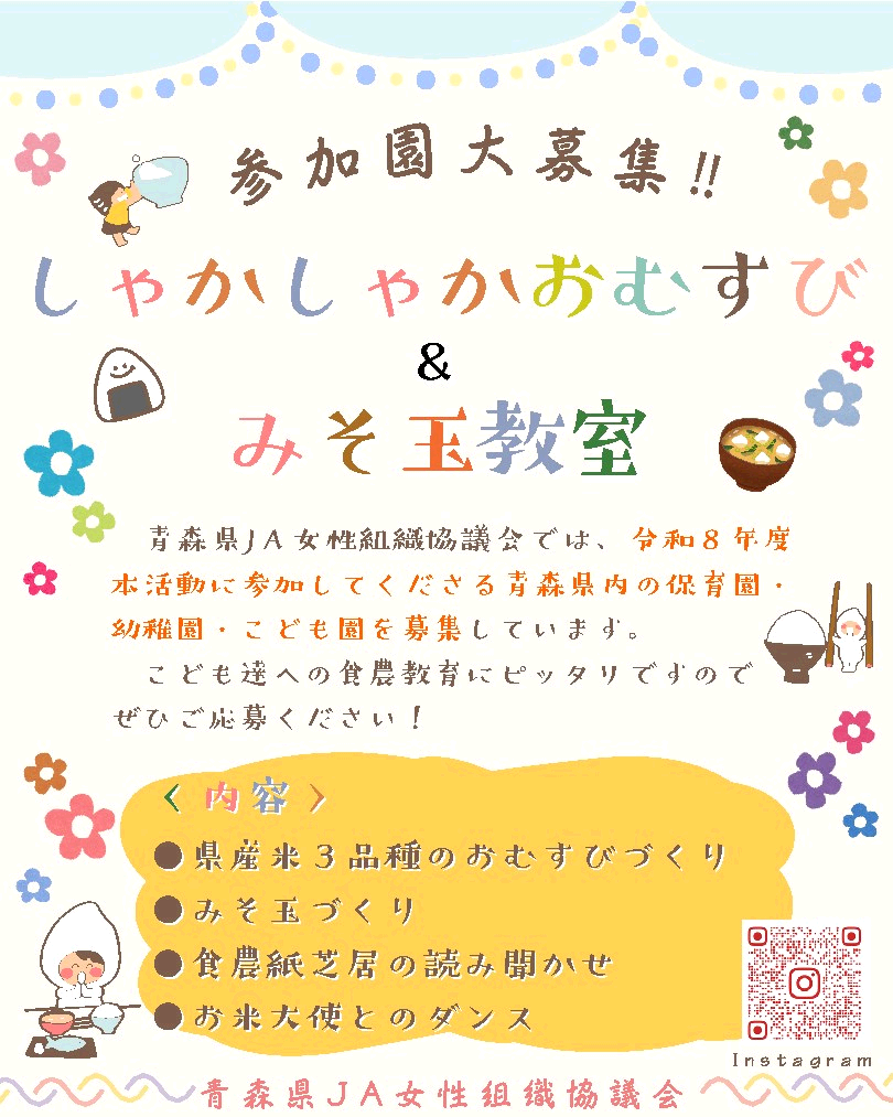 実施にかかる園側の経費負担はなく、具体的な日程は実施が決まった園と相談して決定します。応募は、同協議会のインスタグラムアカウント(@aojyosei)へダイレクトメッセージを送るか、JA青森中央会(電話017-729-8760)へご連絡くださいますようお願いいたします。