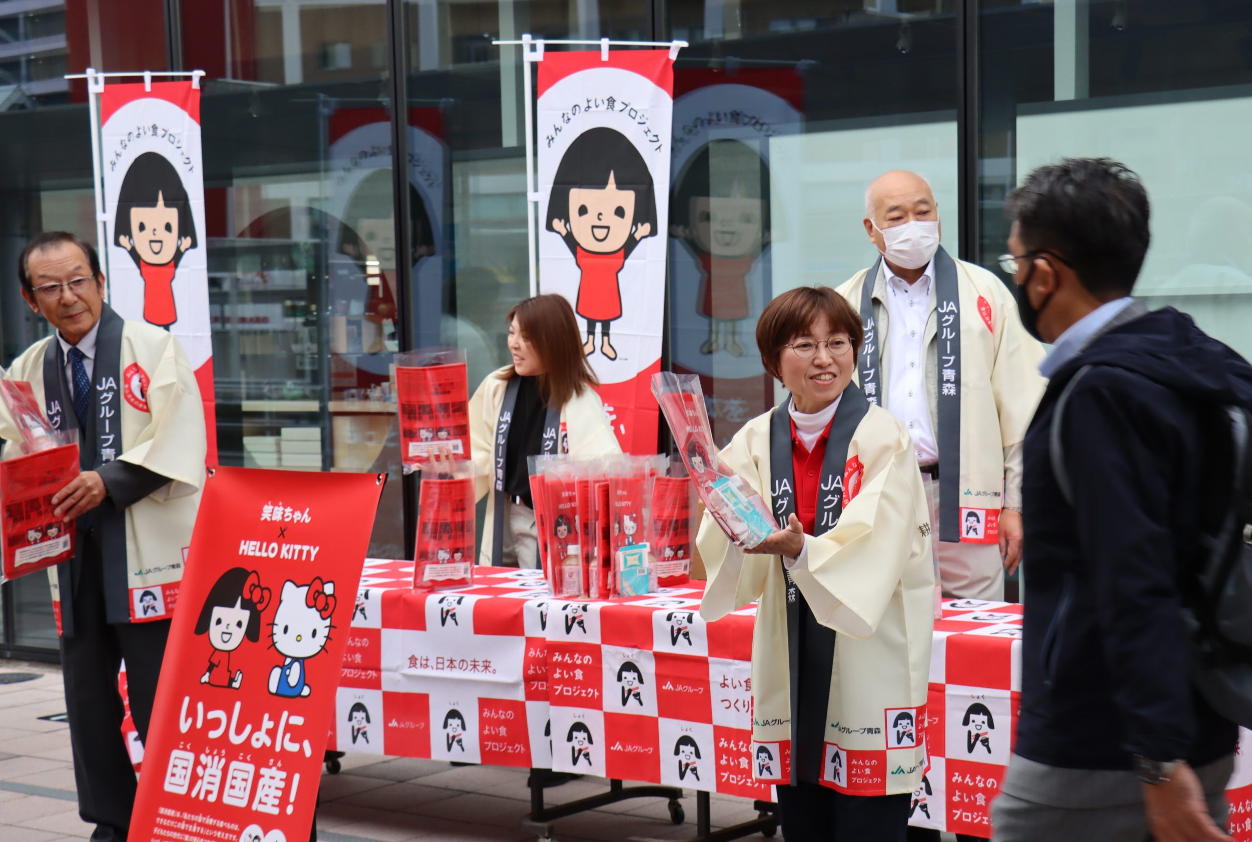 JA青森中央会は10月16日、「国消国産の日」に合わせ、青森市のJR青森駅前で街頭宣伝活動を行った。駅利用客や通行人に「国消国産」をPRするパンフレッドと県産パックご飯、りんごジュースなどを合わせて300セットを配布。国消国産の重要性について理解醸成を図った。