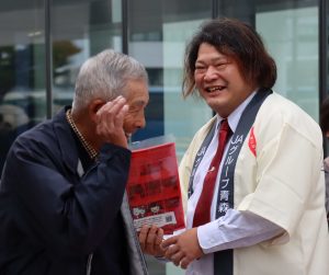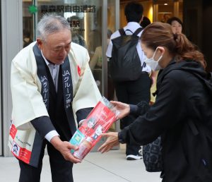 JA青森中央会は10月16日、「国消国産の日」に合わせ、青森市のJR青森駅前で街頭宣伝活動を行った。駅利用客や通行人に「国消国産」をPRするパンフレッドと県産パックご飯、りんごジュースなどを合わせて300セットを配布。国消国産の重要性について理解醸成を図った。