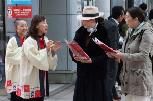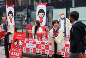中央会の乙部輝雄会長や天内正博副会長の他、県内JAの女性部や青年部の役員らが、パンフレツトを通行人に手渡した。